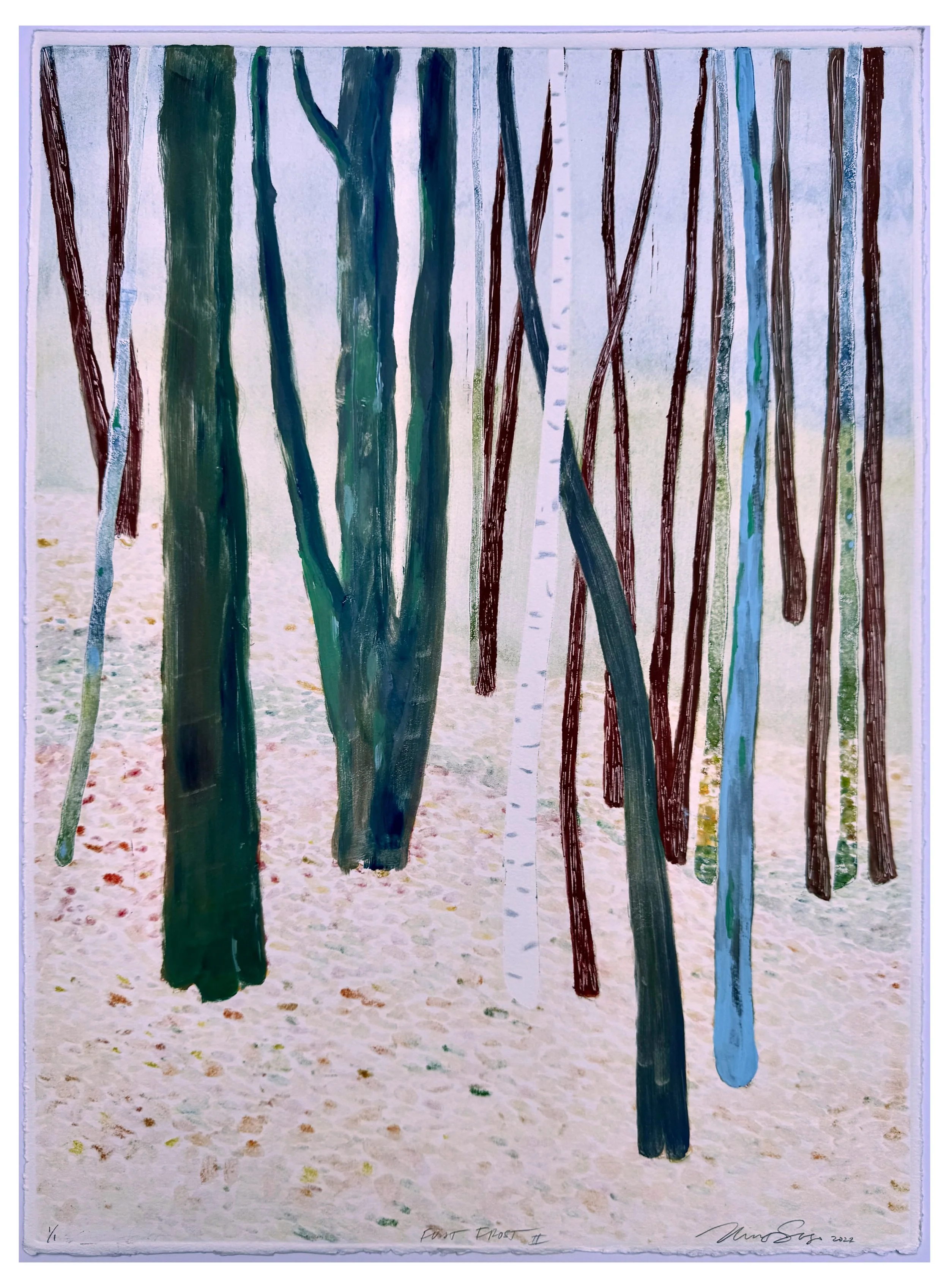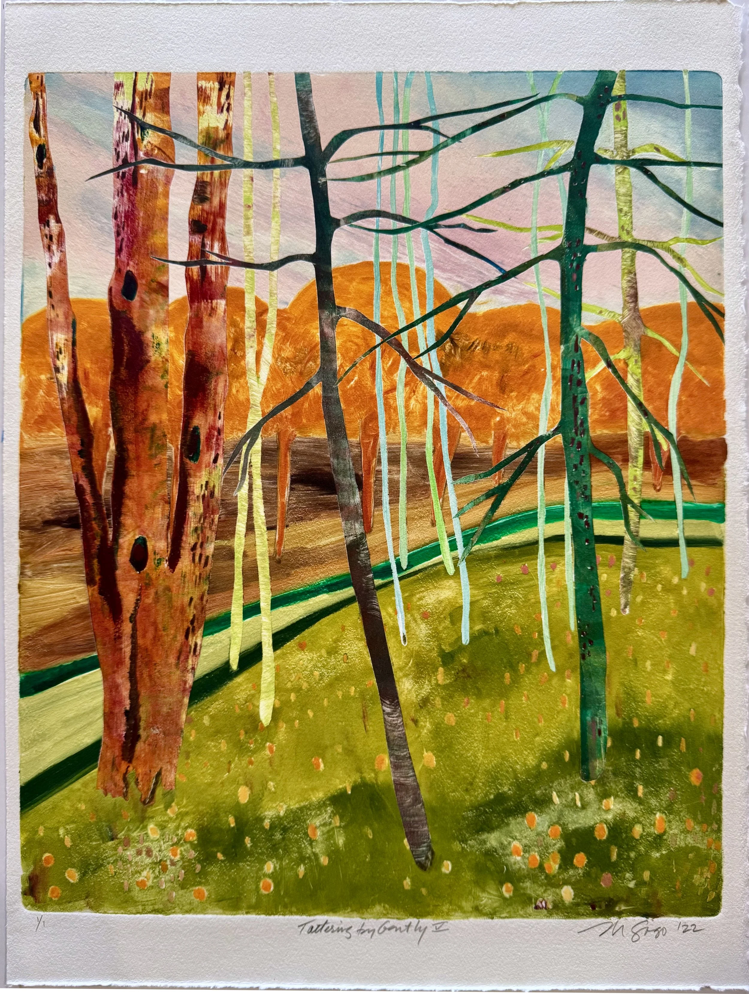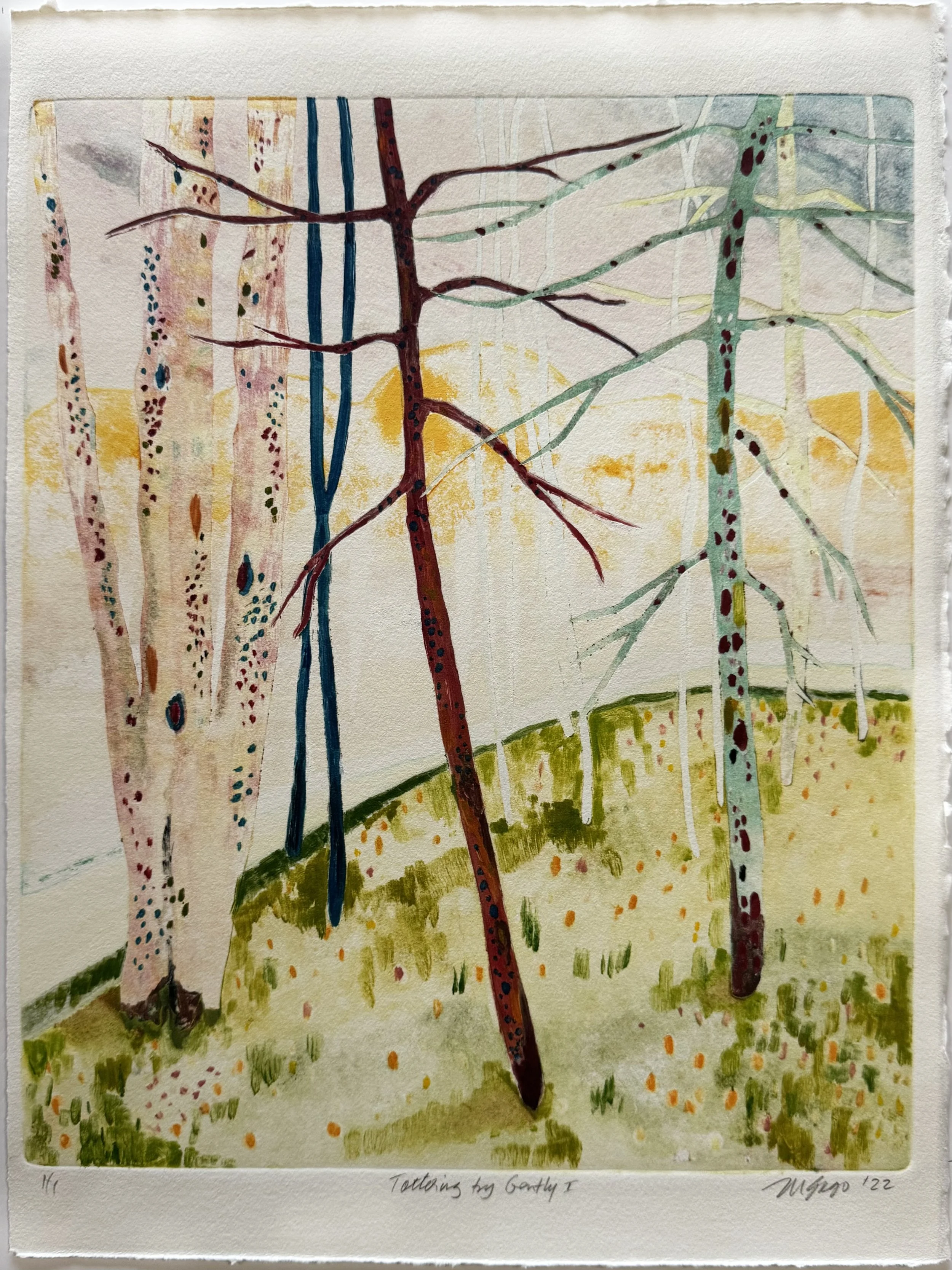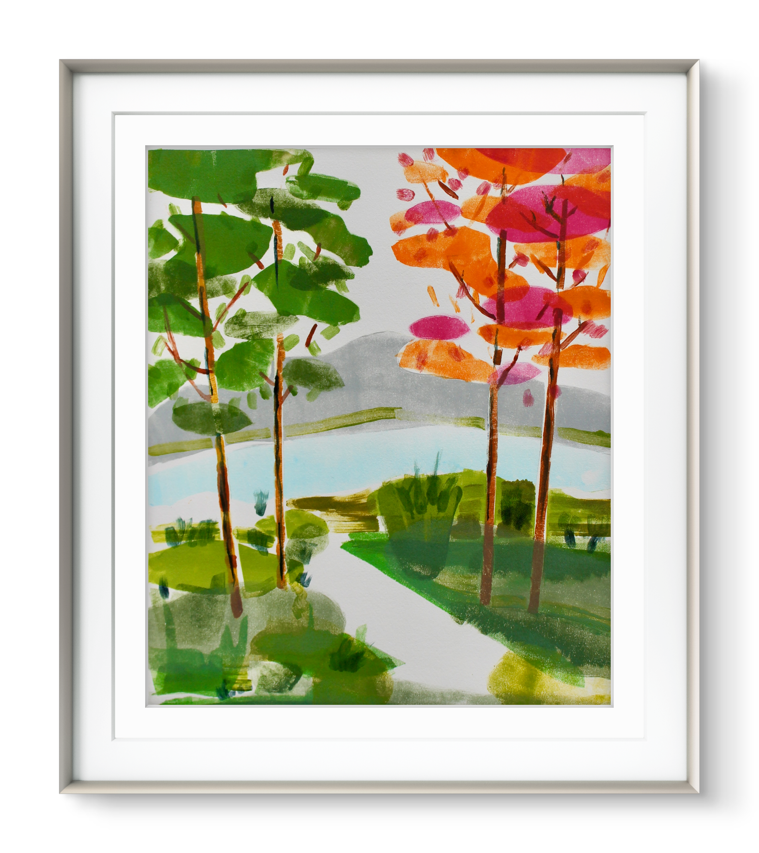 These one-of-a-kind prints are created by painting directly onto a smooth plate, then transferring the image onto paper, which results in a print that feels as immediate and expressive as a painting. With loose mark making and color fields, these landscapes are transformed into lyrical and lively microcosms of fleeting moments.