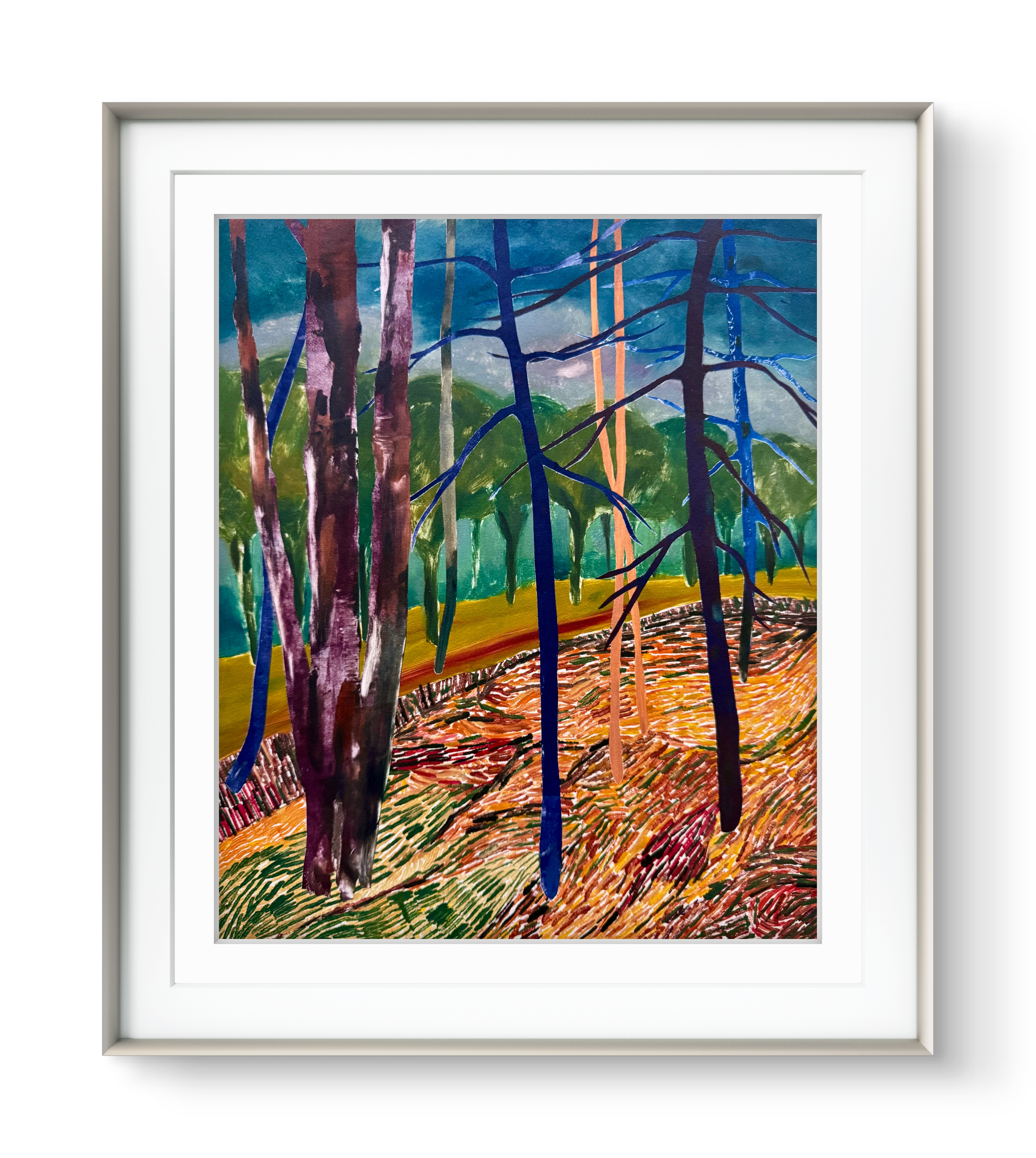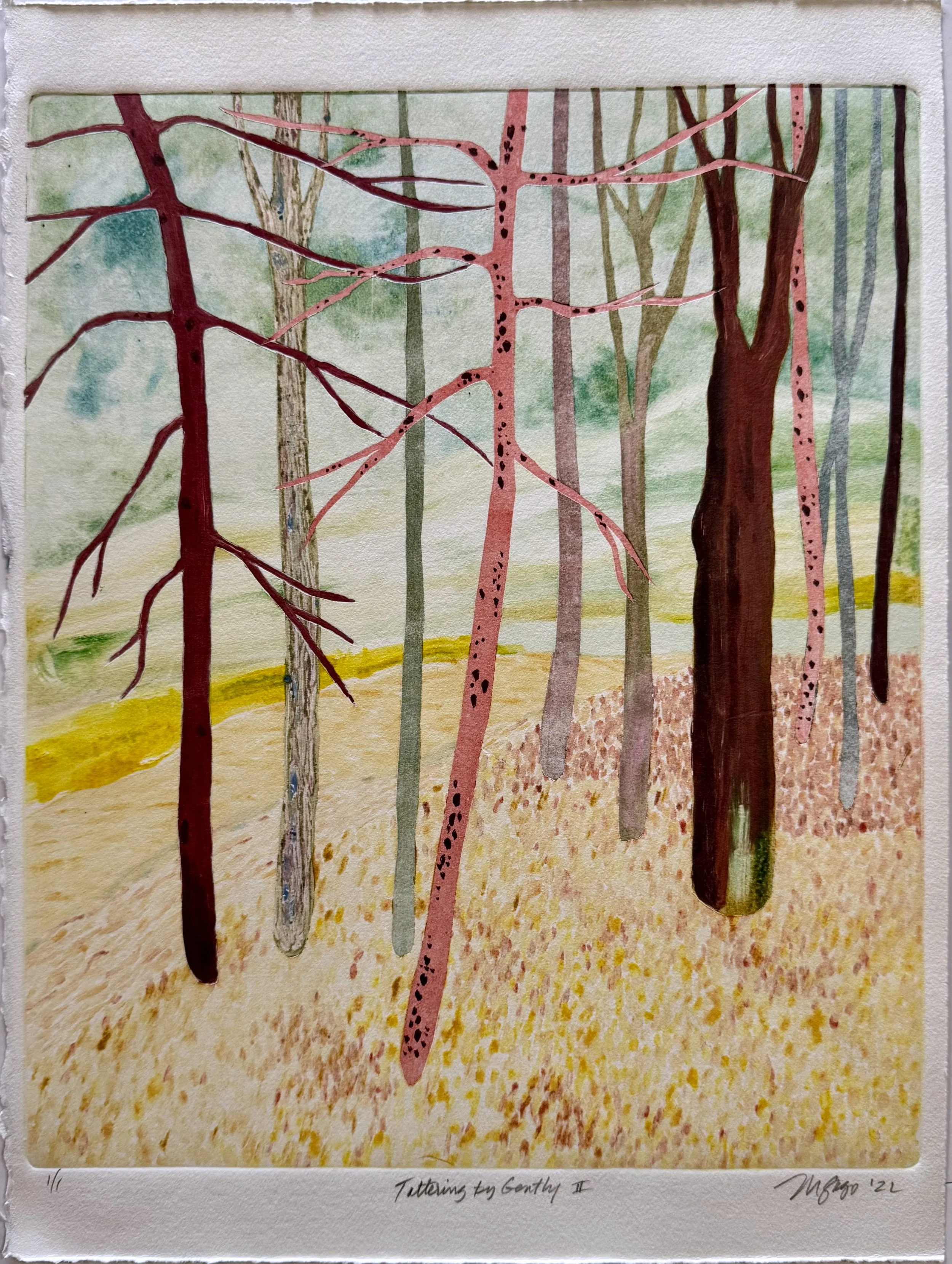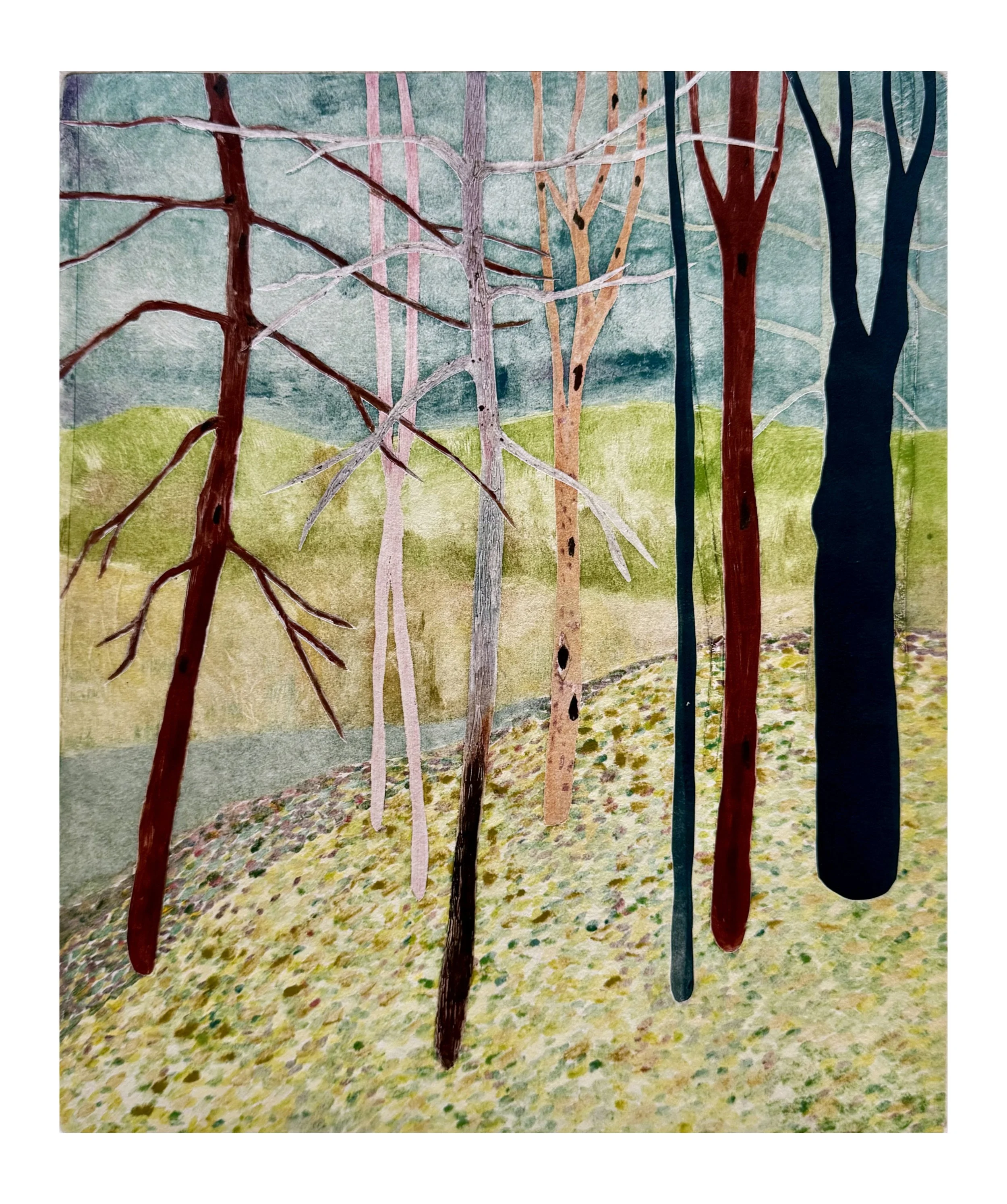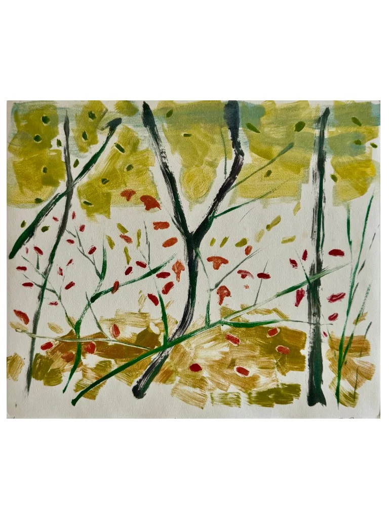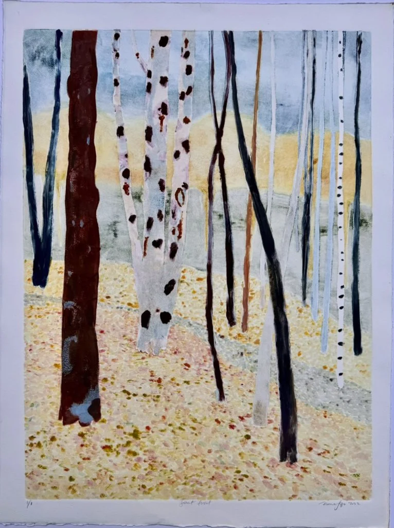 These one-of-a-kind prints are created by painting directly onto a smooth plate, then transferring the image onto paper, which results in a print that feels as immediate and expressive as a painting. With loose mark making and color fields, these landscapes are transformed into lyrical and lively microcosms of fleeting moments.